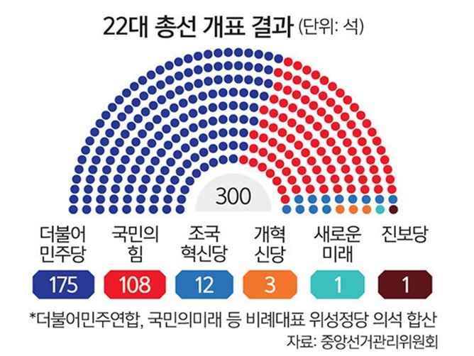 더불어민주당이 단독 과반 의석인 161석을 확보하고 국민의 힘이 90석을, 새로운 미래·개혁신당·진보당은 각 1석씩 차지했습니다.